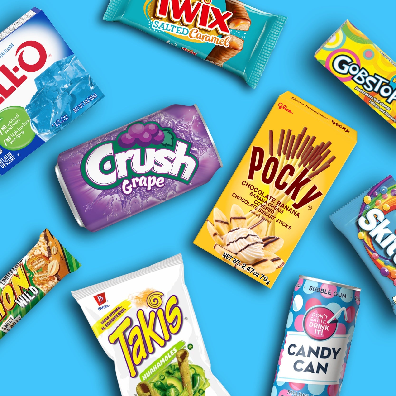 Mike & Ike Original Fruits Small Mike & Ike Tropical Typhoon Small Candy Pop Popcorn Butterfinger Prime Hydration Tropical Punch Kit Kat Chunky Cookie & Cream Twix Spoonable Cookie Dough Fanta Maracuja Prime Hydration Strawberry Watermelon Prime Hydration Meta Moon Reese's Puffs Minis Takis Blue Heat Extra Small Kinder Tronky Lotte One Piece Waffer Chocolate Devil and Angel Coca Cola Bottle Vanilla Big Coca Cola Bottle Cherry Mogu Mogu Ice Lychee Cheetos Crunchy Flamin' Hot Lime Takis Buckin' Ranch Twix Wafer Rolls